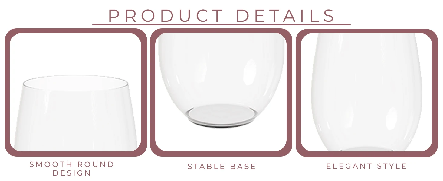 The clear stemless plastic wine glasses are made of High quality PET plastic, heavy duty, unbreakable, shatterproof, disposable and reusable.