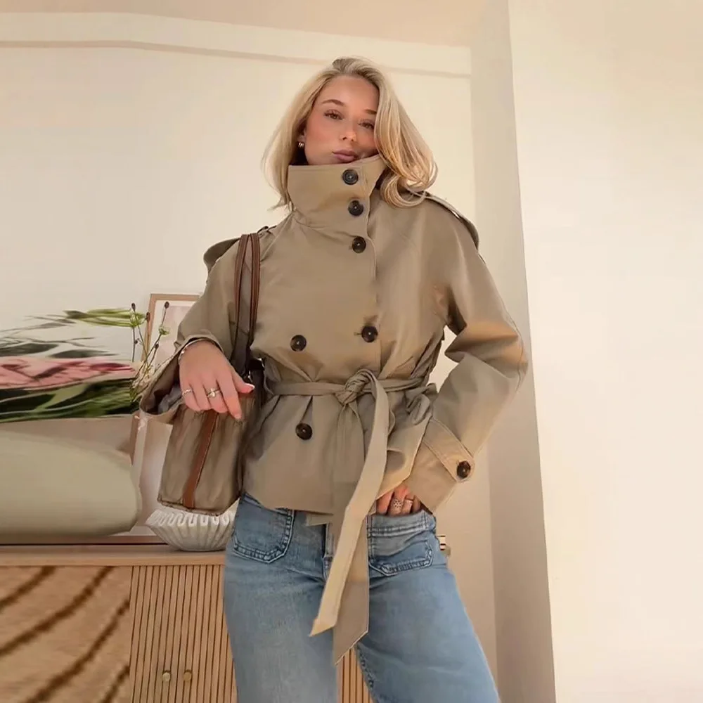 2025 New Autumn Women’s Chic Stand Collar Double-breasted Belted Waist Cropped Trench Coat Shoulder Casual Street Outerwear