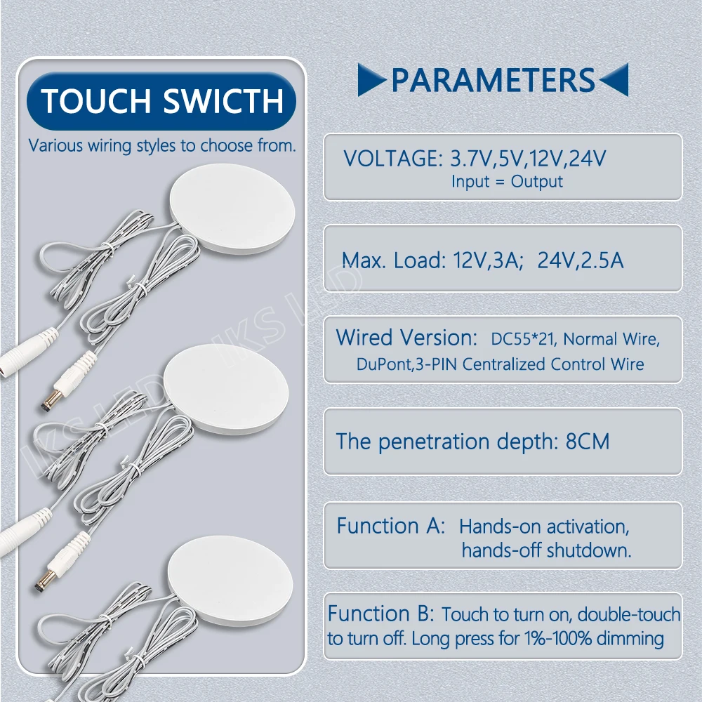 Upgraded large-partition touch switch with penetrating sensing technology. Capable of detecting touch through glass, stone, wood panels, and other non-conductive materials up to 8 cm thick. Compatible with 12V/24V LED lighting systems, it supports toggle and dimming functions via touch gestures.