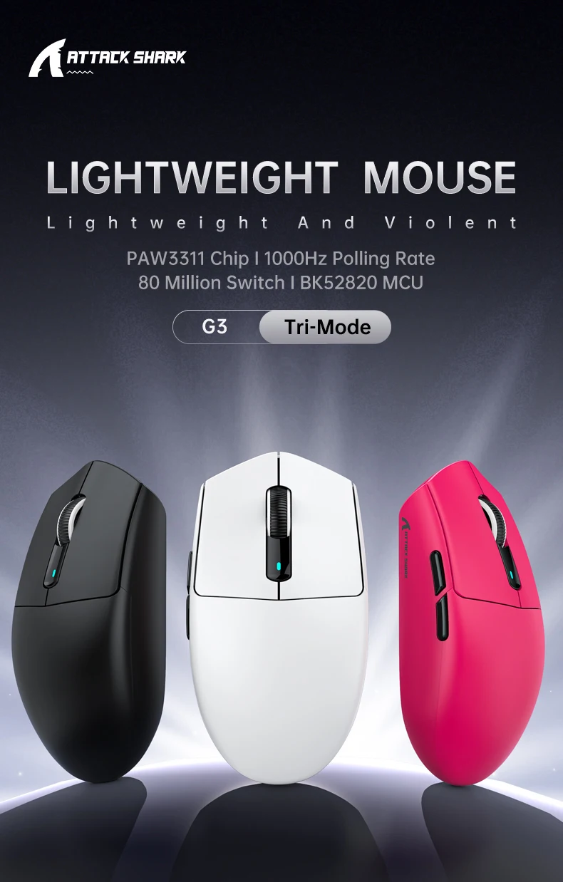 RTTREK SHARK G3 Ultra-Lightweight Tri-Mode Gaming Mouse | 62g Super Light | PAW3311 Sensor 25000DPI | HUANO 80M Switches | 2.4G/BT/Wired | Black/White/Berry Red
