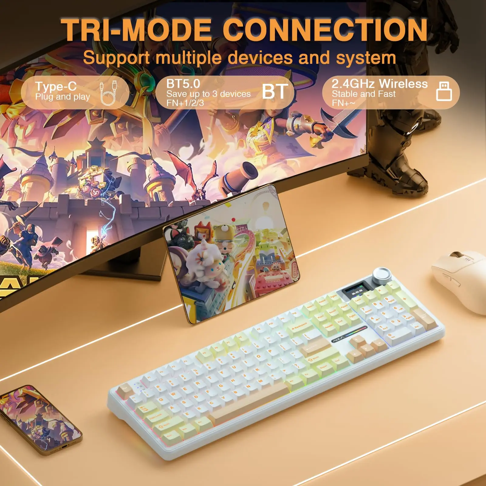 (2).Tri-mode Connection Mechanical Keyboard: The AULA F108 Pro gaming keyboard supports BT5.0, 2.4GHz wireless and USB-C wired connectivity which can save up to five devices. The BT5.0 mode allows for quick switching between pc,mac,laptop and tablets while the 2.4GHz wireless and USB-C wired mode with a polling rate of 1000Hz ensures highly competitive stability and responsiveness.The F108PRO pc gaming keyboard is compatible with Windows, Mac, IOS and Android operating systems, and you can easily switch systems with multifunctional knob(Note: In Linux systems, incompatible driver versions may cause abnormal F-zone functionality, which is a normal phenomenon. Please rest assured to use it)
