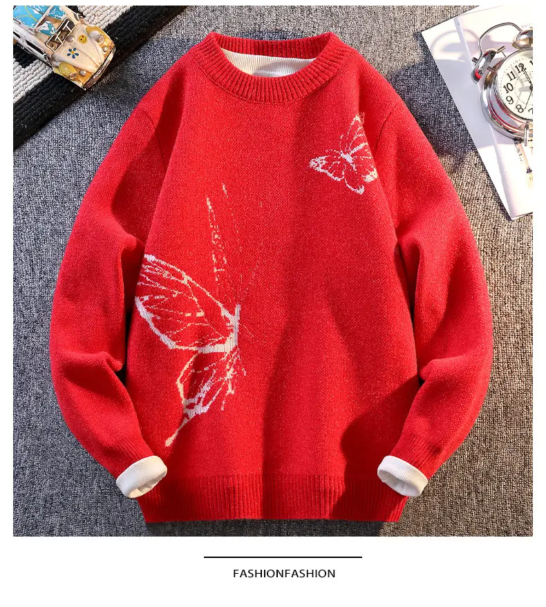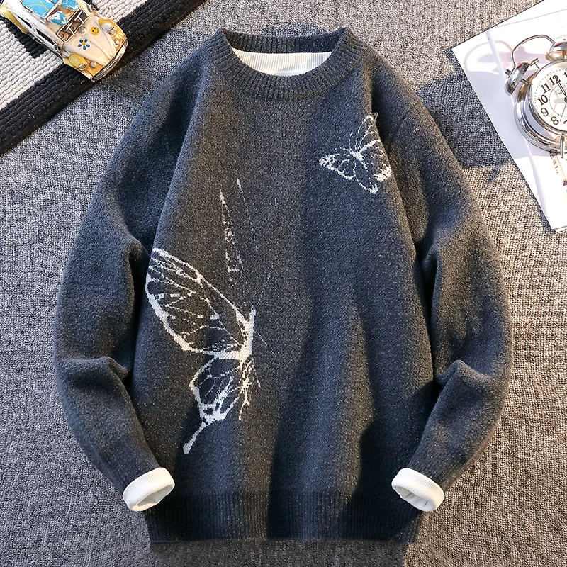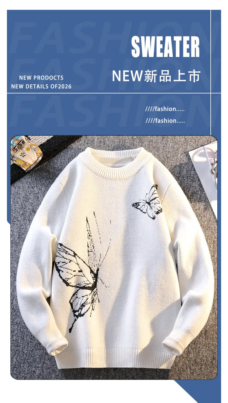 Autumn/Winter Fashion Butterfly Printed O-neck Sweater Solid Color Warm Knitted Sweater Men’s Pullover Home Clothes