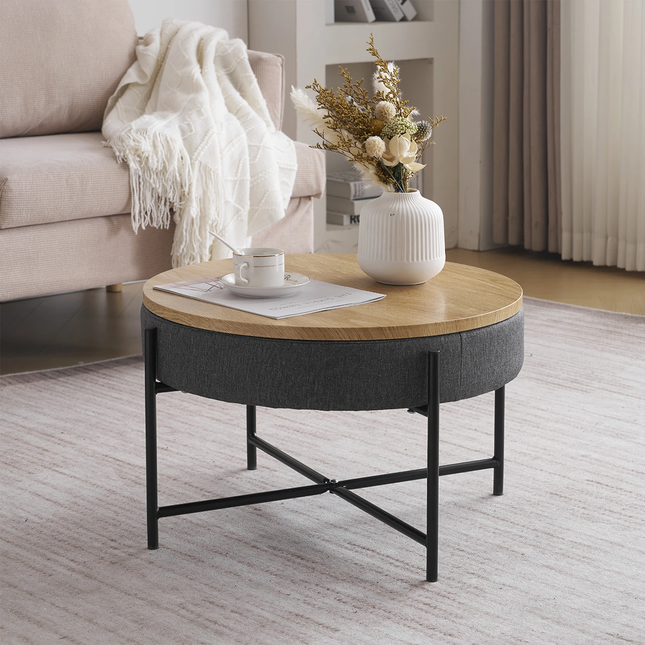 BonChoice Rustic Round Coffee Table with Removable Top & Storage for Living Room, Modern Round Sofa Side End Tables with Fabric Body&Metal Legs