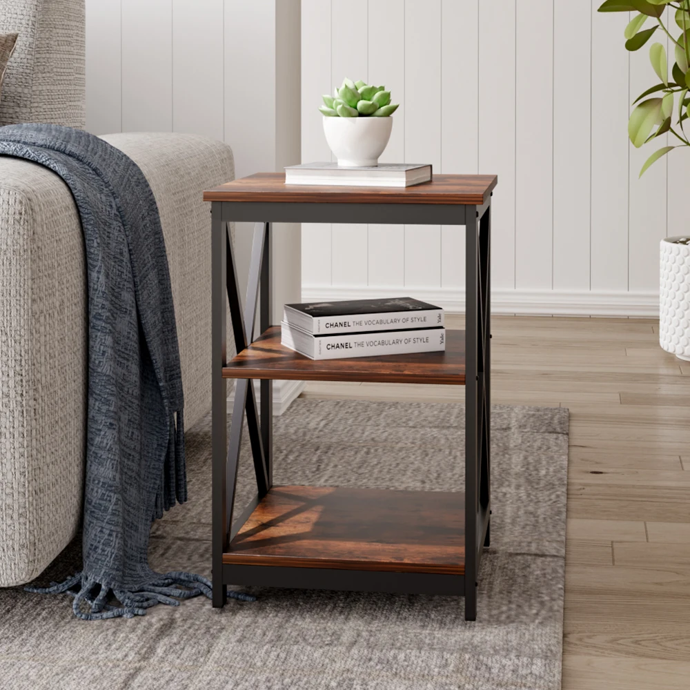 Place this Livingandhome compact side table next to the bed, sofa, or any other preferred spot to create a cozy nook. Its minimalist design is complemented by the clean lines, ensuring that it will not dominate the room, yet it offers a convenient top for your cup, mobile phone, snacks, or any item you want to keep within reach. Additionally, the table provides an ideal display area with 2 shelves for vases, art sculptures, and books, adding warmth and an artistic touch to your space.