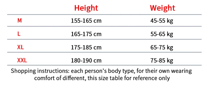 | size_info | {"sizeInfoList":[{"length":{"cm":"155-165CM","inch":"61.02-165CM"},"size":"M","vid":-2},{"length":{"cm":"165-175CM","inch":"64.96-175CM"},"size":"L","vid":-3},{"length":{"cm":"175-185CM","inch":"68.90-185CM"},"size":"XL","vid":-4},{"length":{"cm":"180-190CM","inch":"70.87-190CM"},"size":"XXL","vid":-5}]} |