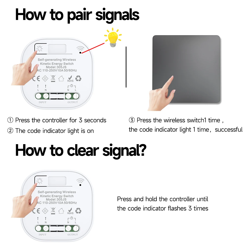 👍.3,Easy to install, the switch panel does not require rewiring. Simply connect the receiver to the live and neutral wires of the desired light, and press the switch panel to control the light on and off.We have matched the product code when it leaves the factory, and there will be no code confusion, so you can use it directly! (the original wall switch must be powered on).