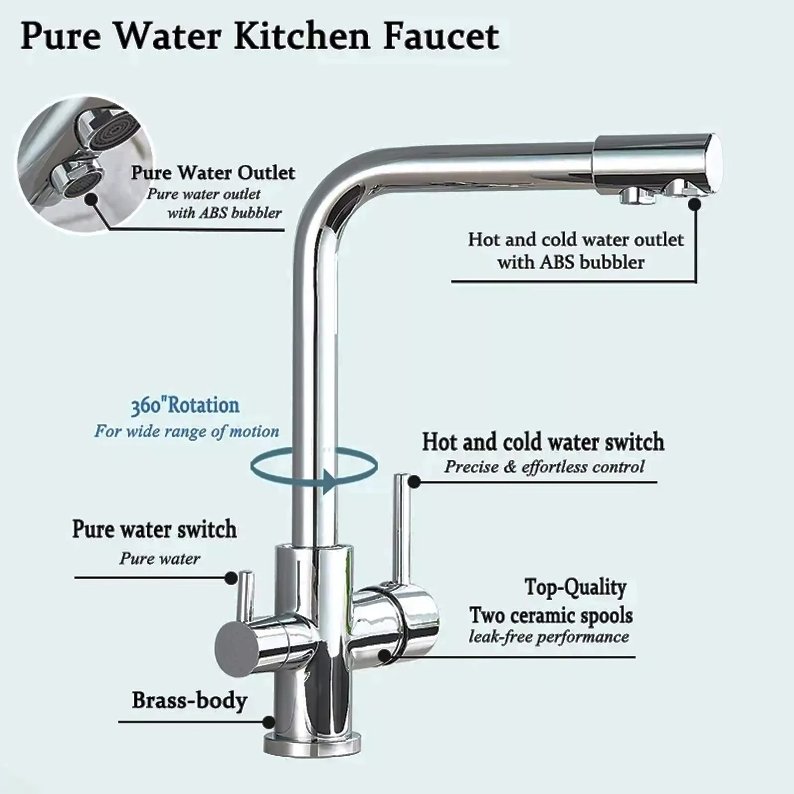 Grifo de cocina de lujo de latón cromado para agua purificada, mezclador de cocina con filtro de tres pasos, apto para agua potable caliente y fría, con doble manija.