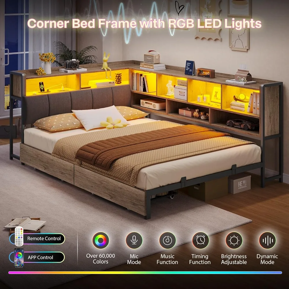 Corner Bed Frame with Bookcase Storage,Twin Bed Frames with Storage Drawers&Led Lights,Platform Bed Frame Twin,Metal Daybed,Corn