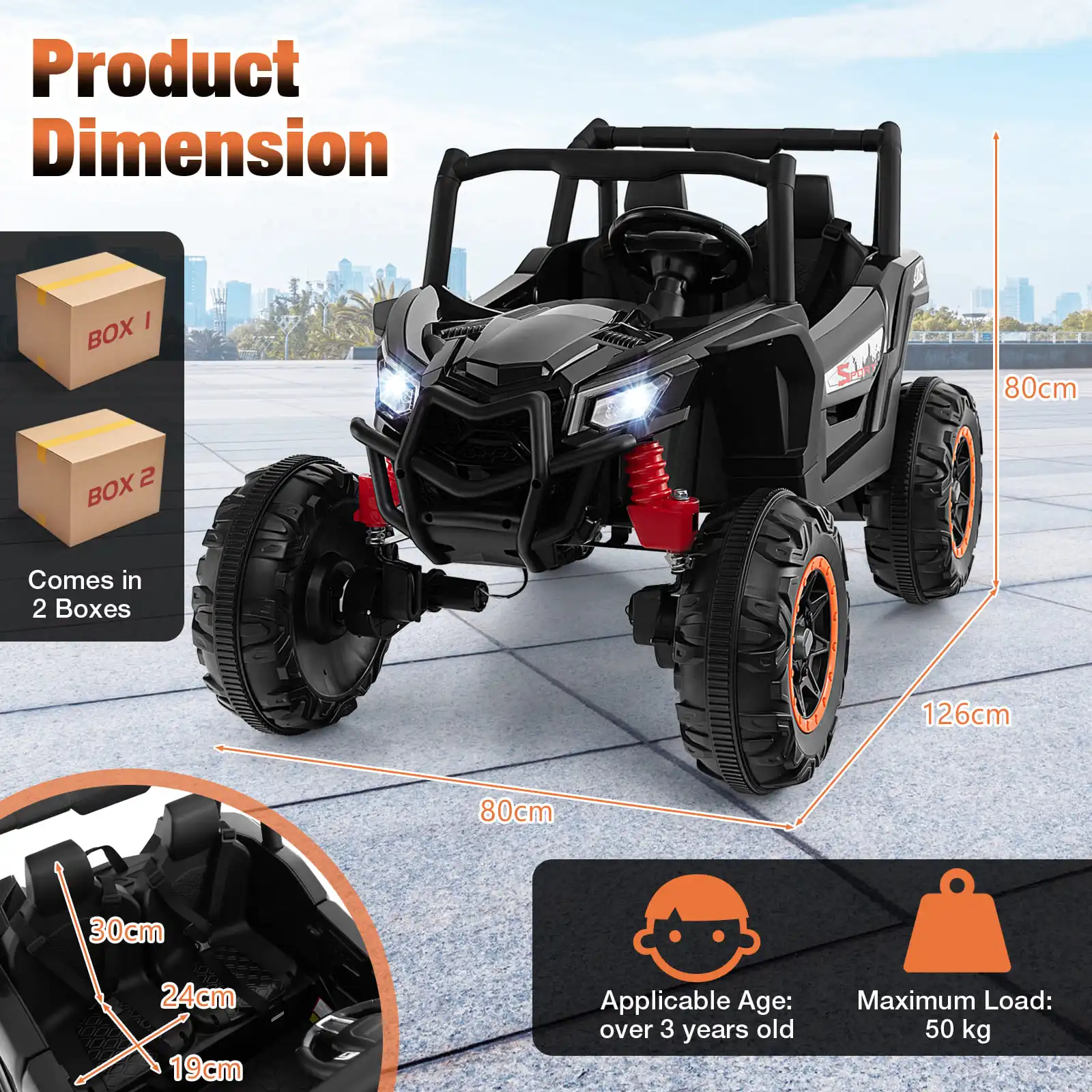 24V 2-Seater Ride On UTV: This electric UTV is driven by a robust 24V 7AH battery that ensures extended playtime for your little explorers. Besides, the spacious 2-seat design with 3-point safety belts can easily accommodate 2 kids over 3 years old while the lockable doors ensure higher safety.