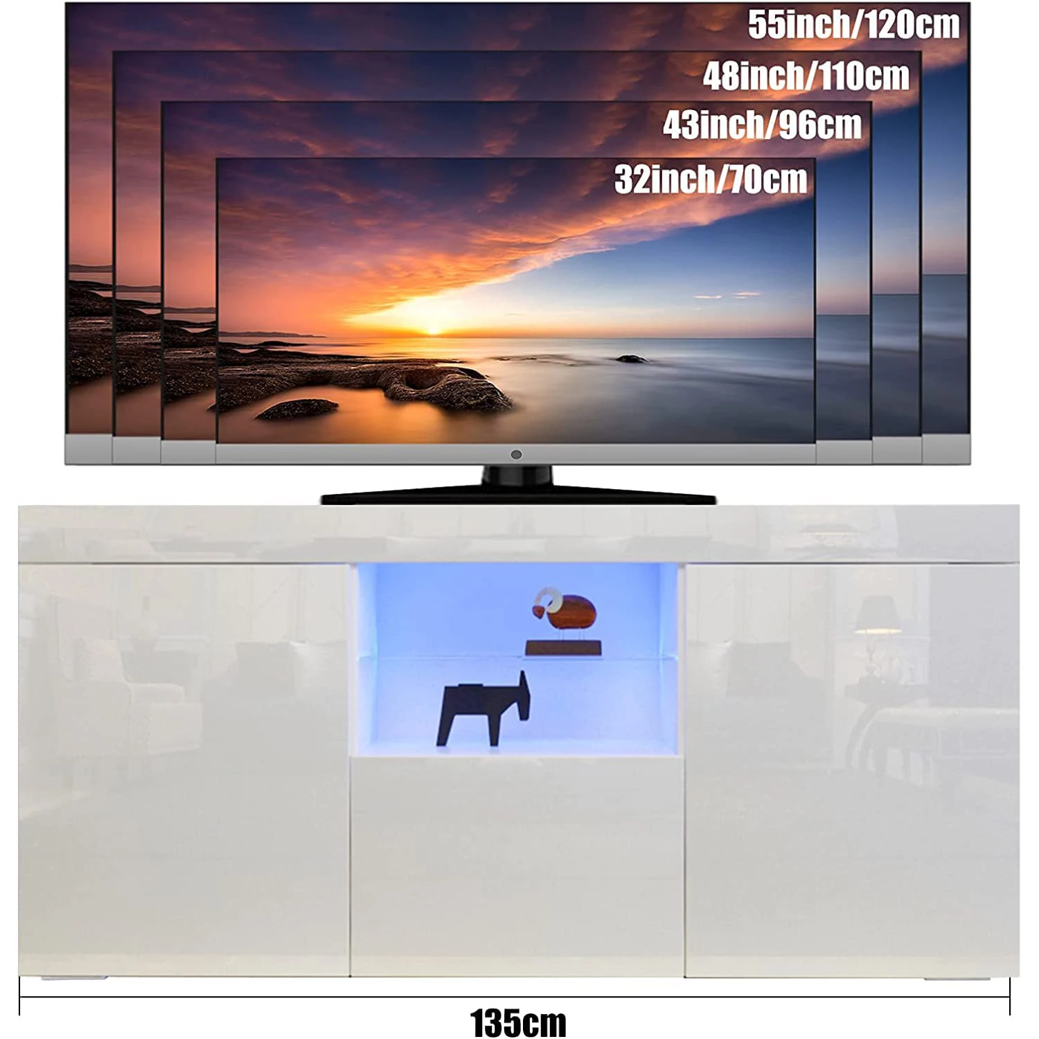 【LED Lighting and High Gloss Fronts】The LED lighting creates an atmospheric atmosphere and also becomes a subtle light source. With UV painted finish high-gloss fronts, you demonstrate a sense of style and set a modern eye-catcher on your TV wall. Morden apperaance and design make this TV stand can well match a variety of decoration styles for your home.