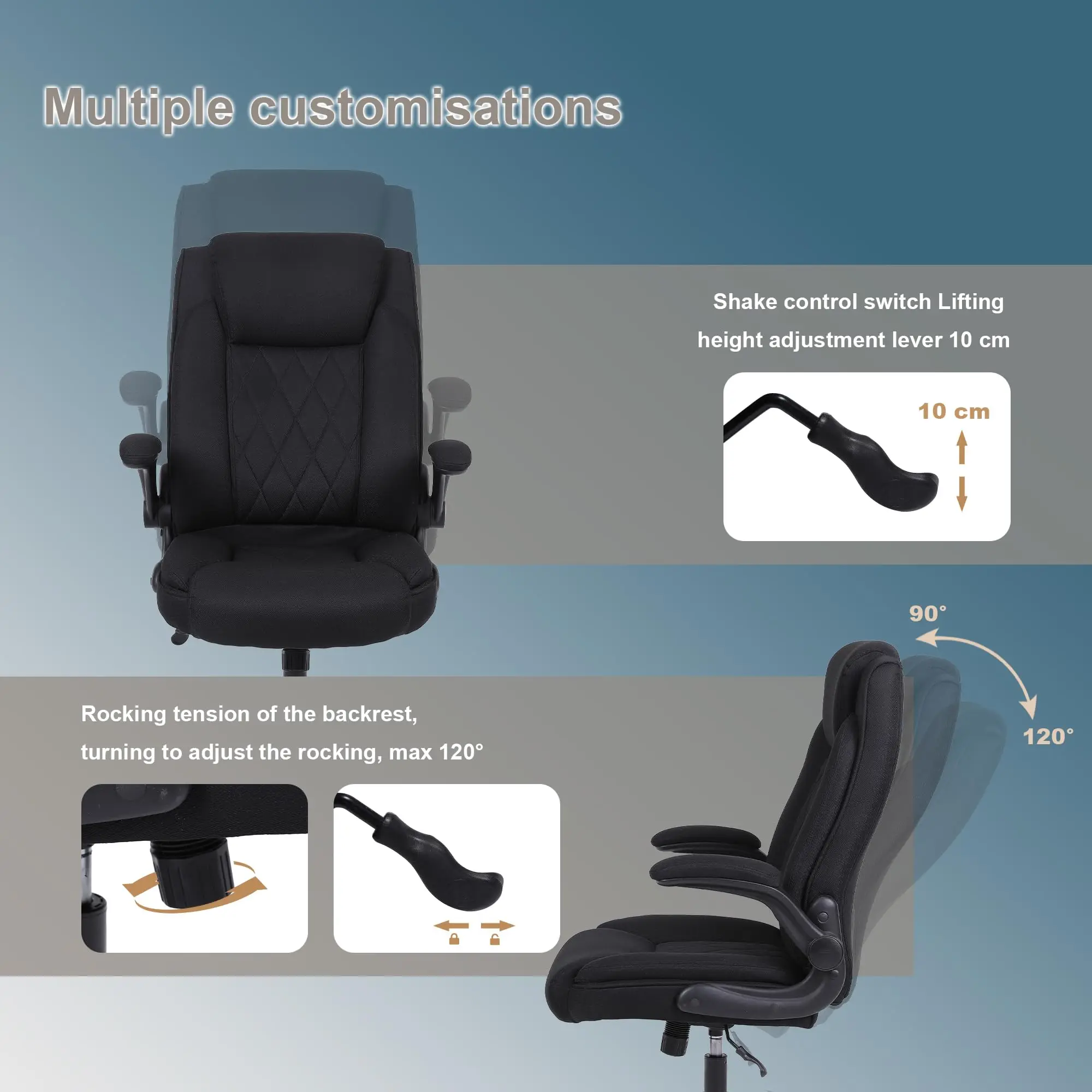 • 【Flexible adjustment】High office chair, seat height can be adjusted up and down 10CM to meet the needs of people of different heights, 90°-120°adjustable backrest tilt angle to adapt to a variety of sitting postures, 90 ° reversed armrests, easy to place under the table to save space.