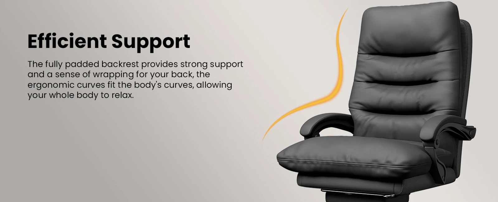Heavy Duty Base,Stronger load bearing and more stable135° Tilt-locking Backrest: 95° Focus on Work / 120° Relaxation break / 135° Take a napThe Ultimate Experence: Waterproof leather / Soft foam / High density spongeErgjonomic Office chairErgonomic backrest / Foam padded cushion / Retractable footrest