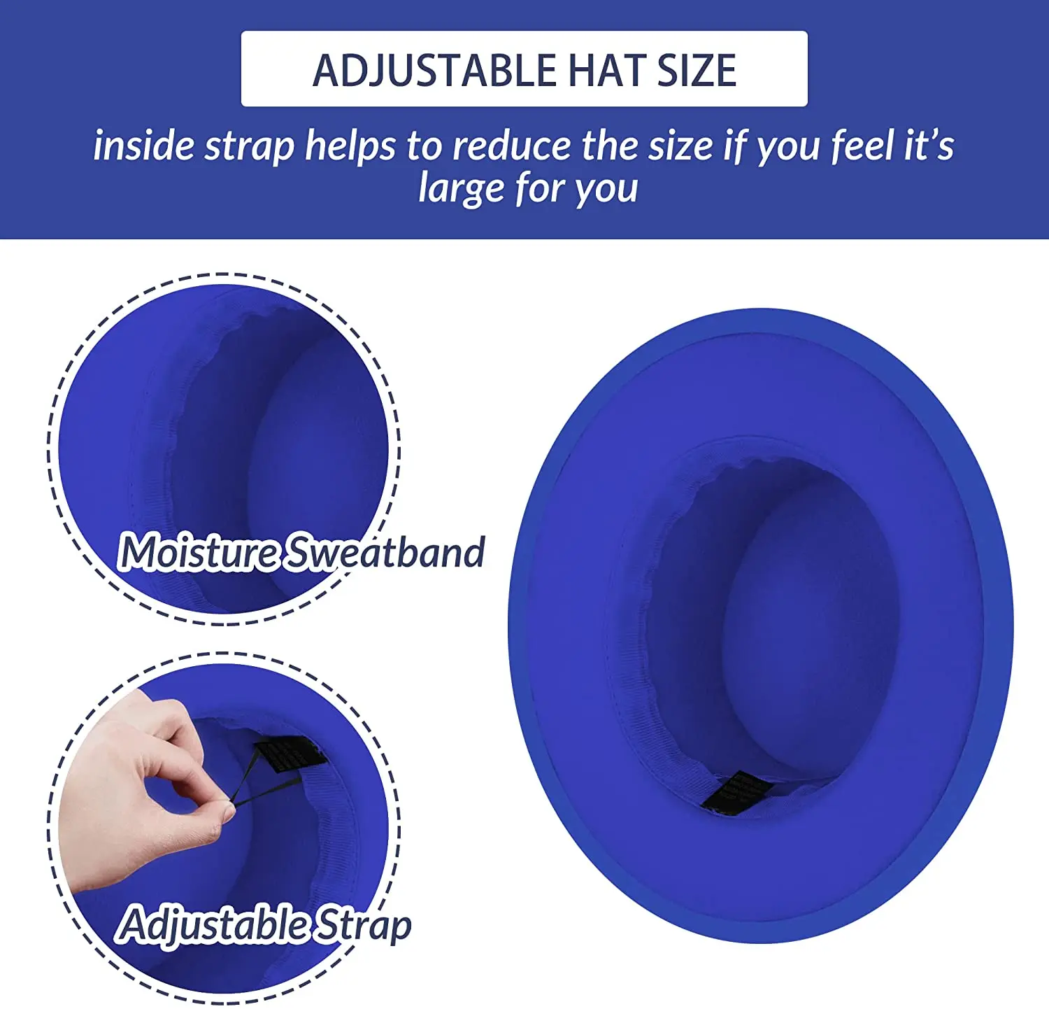 • Size:Hat circumference:57-58cm/22.5″-22.8″,brim width:M:5.5cm/2.17″,Height:8.5cm/3.4″,suitable for most women and men.and with adjustable strap Inside,you can adjust the fedora hat to fit well.