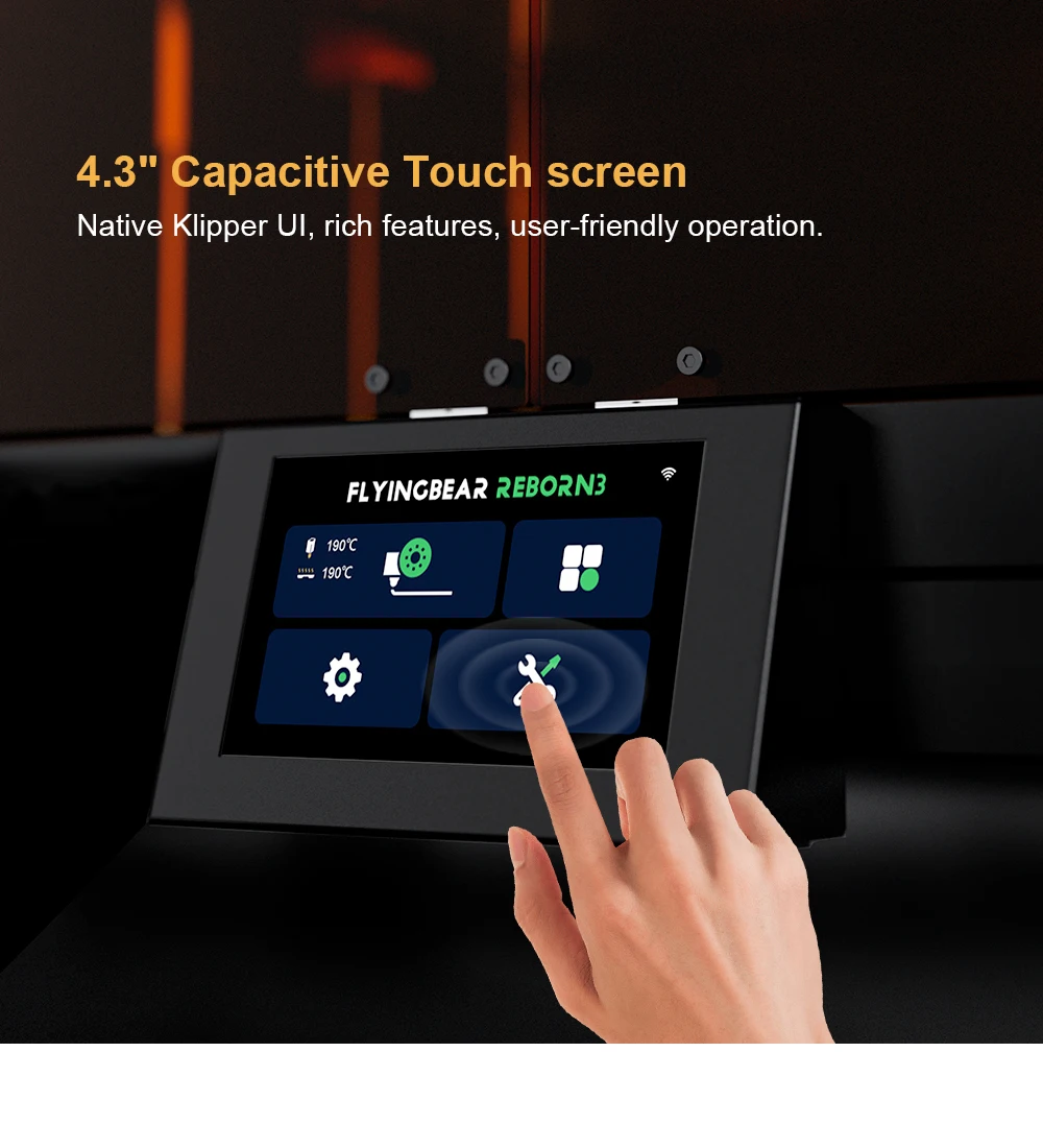 ● Customized 4.3-inch capacitive screen,feature-rich UI with Klipper firmware,simple to operate.