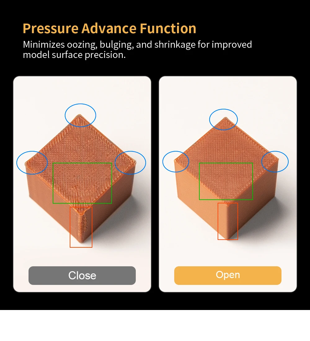 ● Pressure Advance Function: Minimizes oozing, bulging, and shrinkaging,to improve model surface precision.