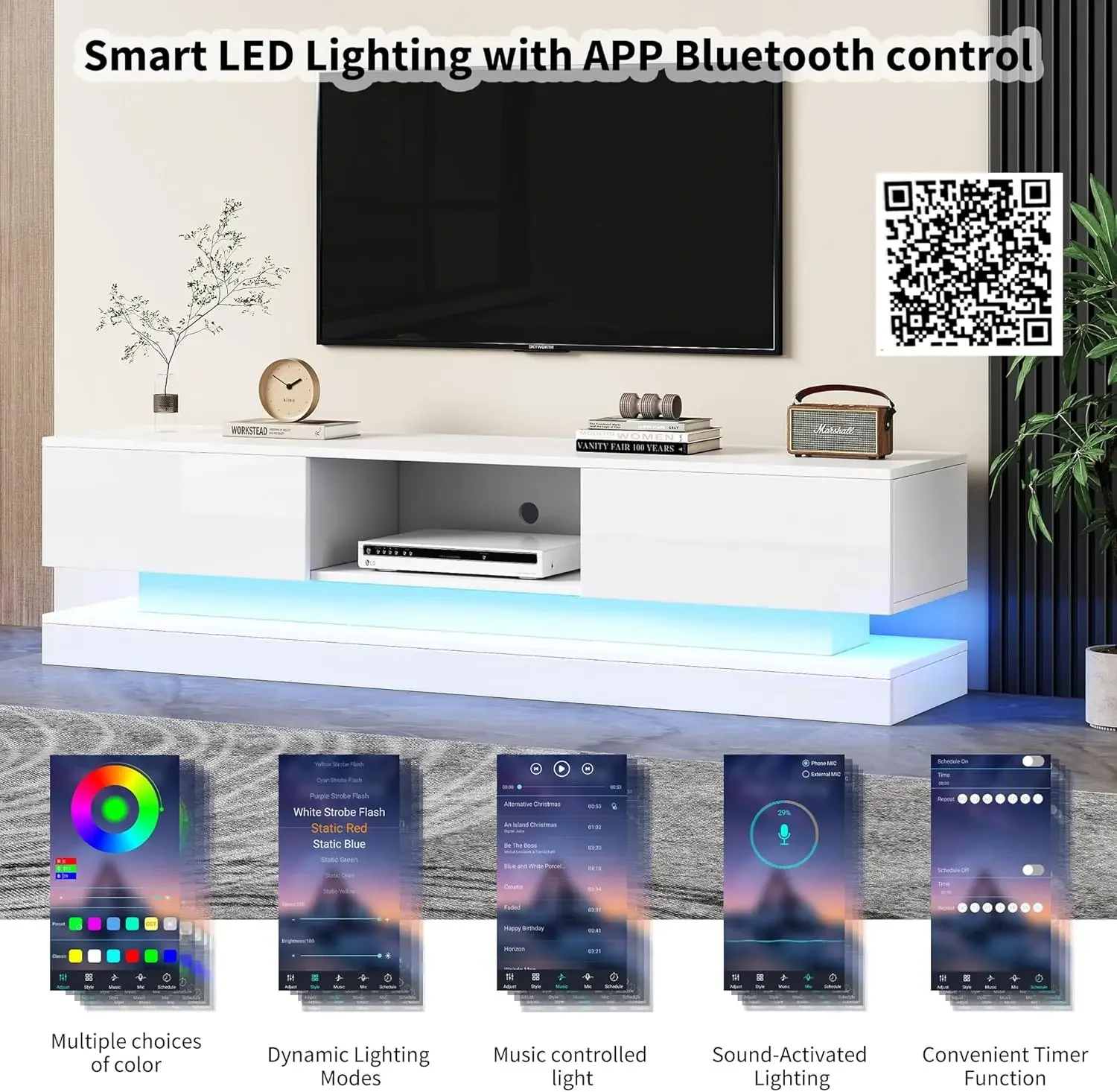 • LED TV Stand: LED ambient light with 16 static colours and 4 dynamic modes, USB cable and remote control (without plug and batteries) creates a wonderful atmosphere to decorate your living room at night.