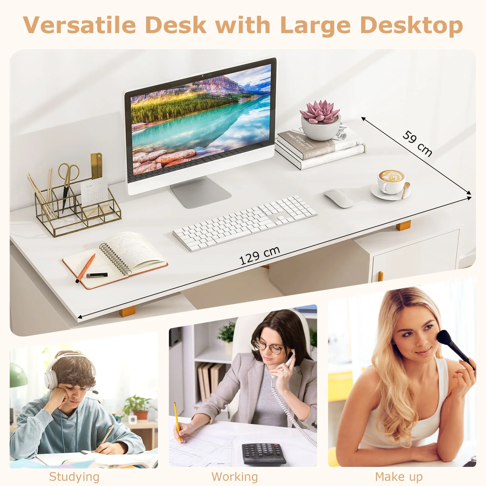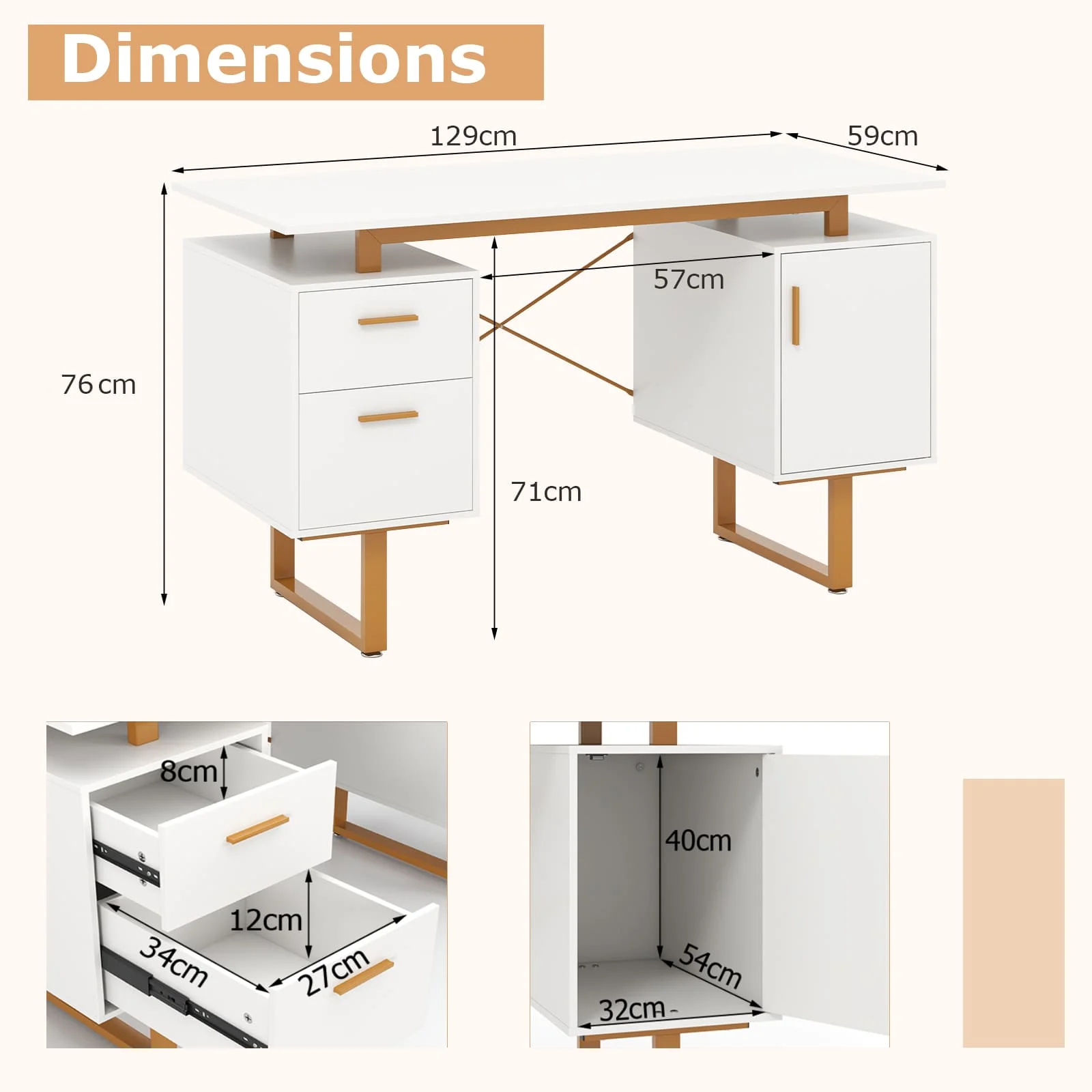 With a roomy desktop, this computer desk offers ample workspace and large storage. It boasts dual drawers and an enclosed cabinet for storage, all supported by a stable metal frame with adjustable foot pads. The modern design features a floating desktop for a touch of elegance and additional storage below. The home office desk is the perfect size at 129cmL x 59cmW x 76cmH and suitable for a study, home office, or bedroom without occupying too much space. More user-friendly details await your discovery.