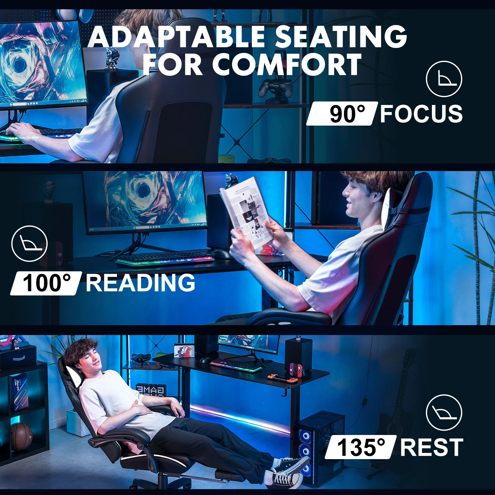 • 【Integrated Linkage Design】: The linkage armrest of our office chair is a major feature that can automatically adjust according to the backrest angle. Its appearance makes traditional complex adjustments simple, while avoiding elbow strains. The seamless tilt of 90°to 135° can perfectly synchronize with your body at any time. The innovative linkage armrest aims to reduce user discomfort and provide you with all-round support, making it easier for you to stay focused and relaxed during intense gaming.