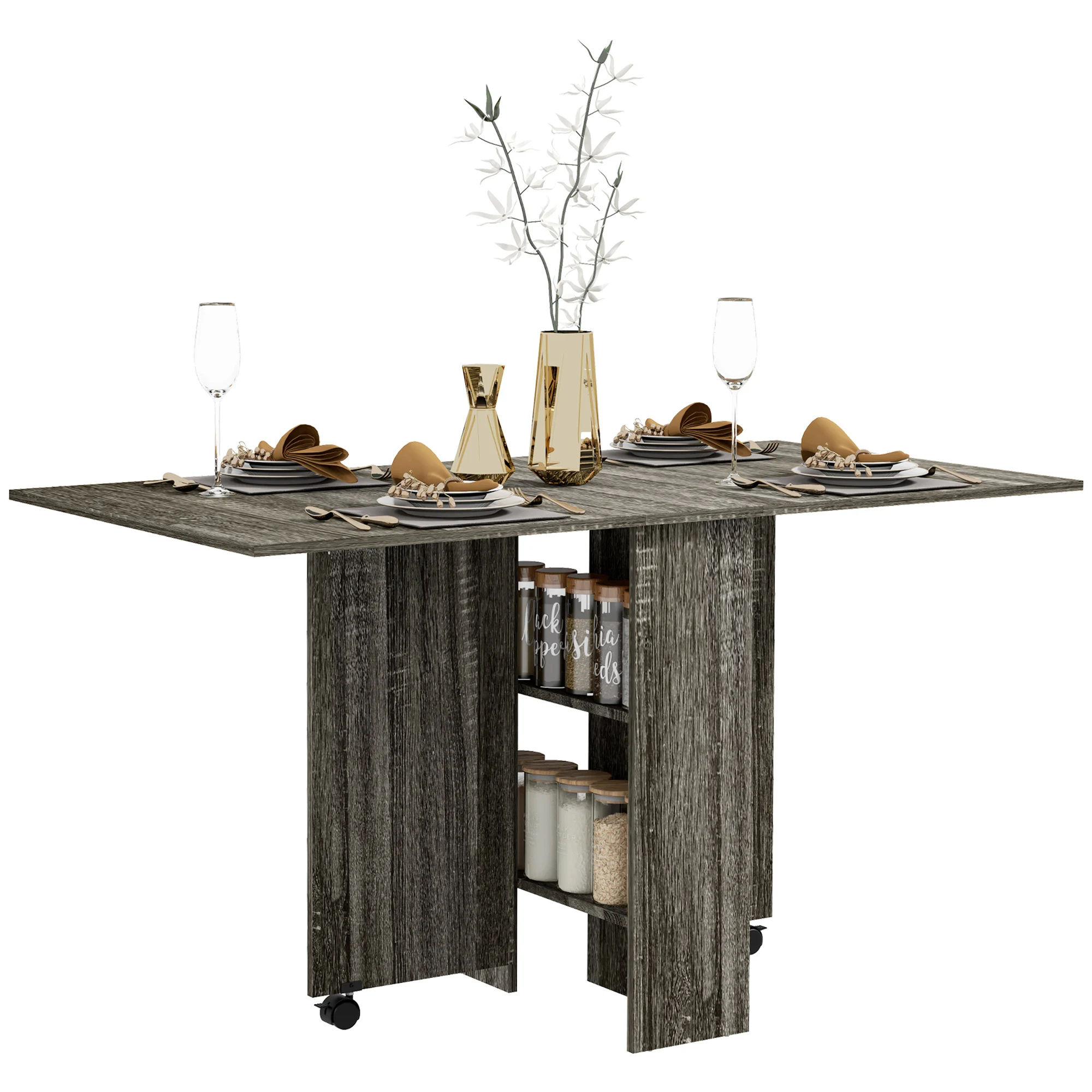 Make large unused tables at home a thing of the past. Choose this HOMCOM drop leaf dining table for extending surface space, whenever you need it. Both sides lift up and drop down super easily. Inside there are two shelves for close by and discreet storage – easy to keep things close to you. Side panels are complete with braked wheels for expanding and folding the kitchen table conveniently.