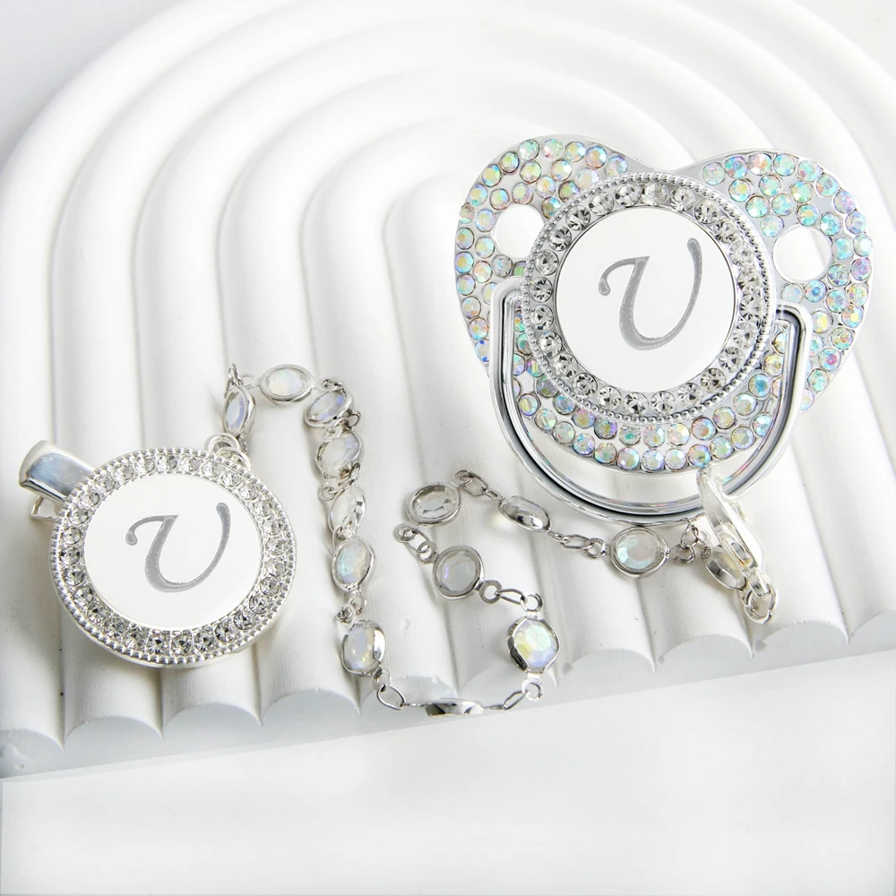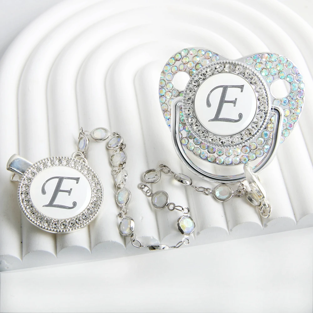 Initial Letter Siliver Baby Pacifier With Colorful Gem BPA Free Luxury Silver Dummy Soother Chupeta