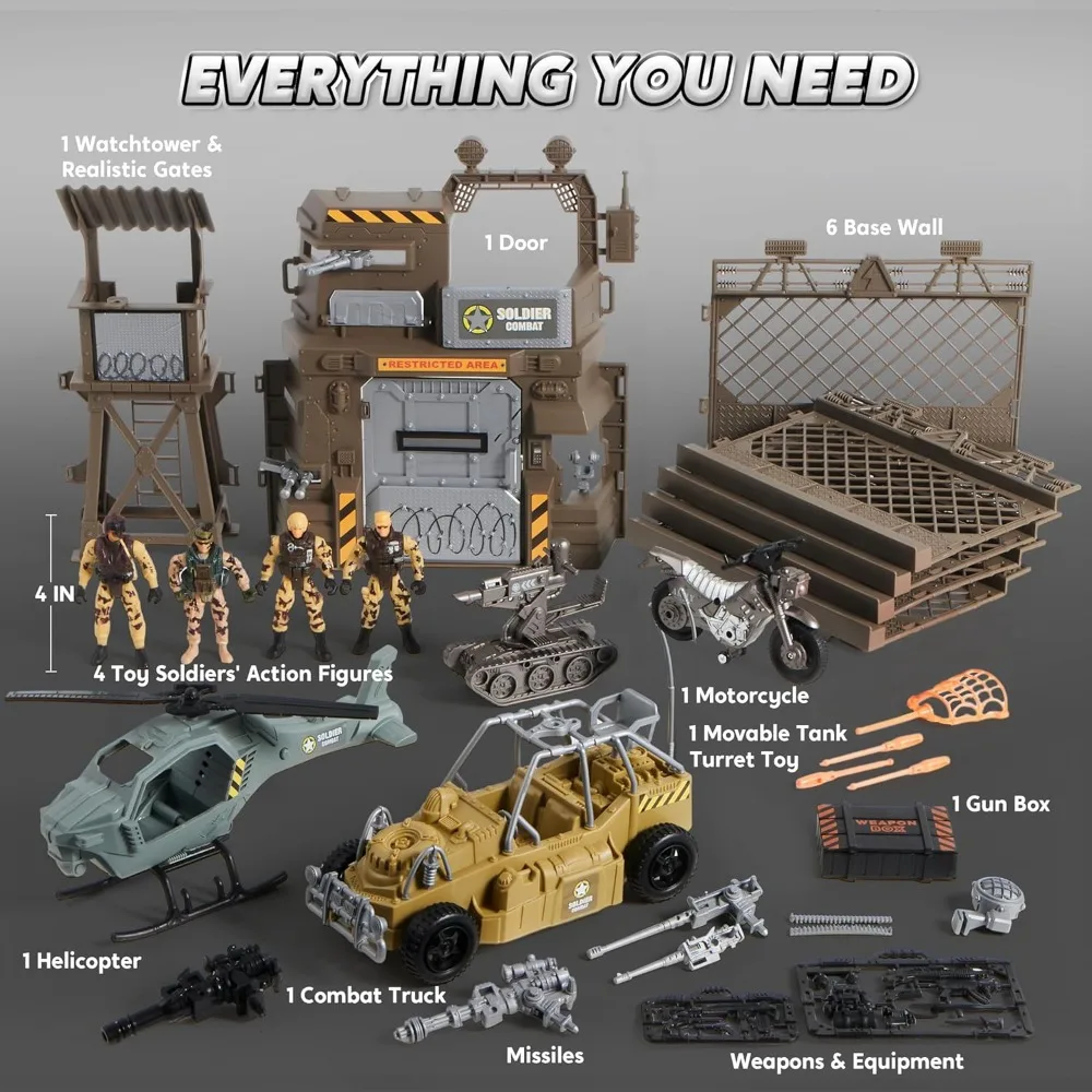 SUPER VALUED COMPREHENSIVE SET. Our super valued comprehensive Military Base Toys Set including 1 door, 1 watchtower & realistic gates, 1 helicopter, 1 combat truck, 1 movable tank turret toy, 1 motorcycle, 4 toy soldiers action figures (4 inches), missiles and net in 1 weapon box, various weapons & equipment.
