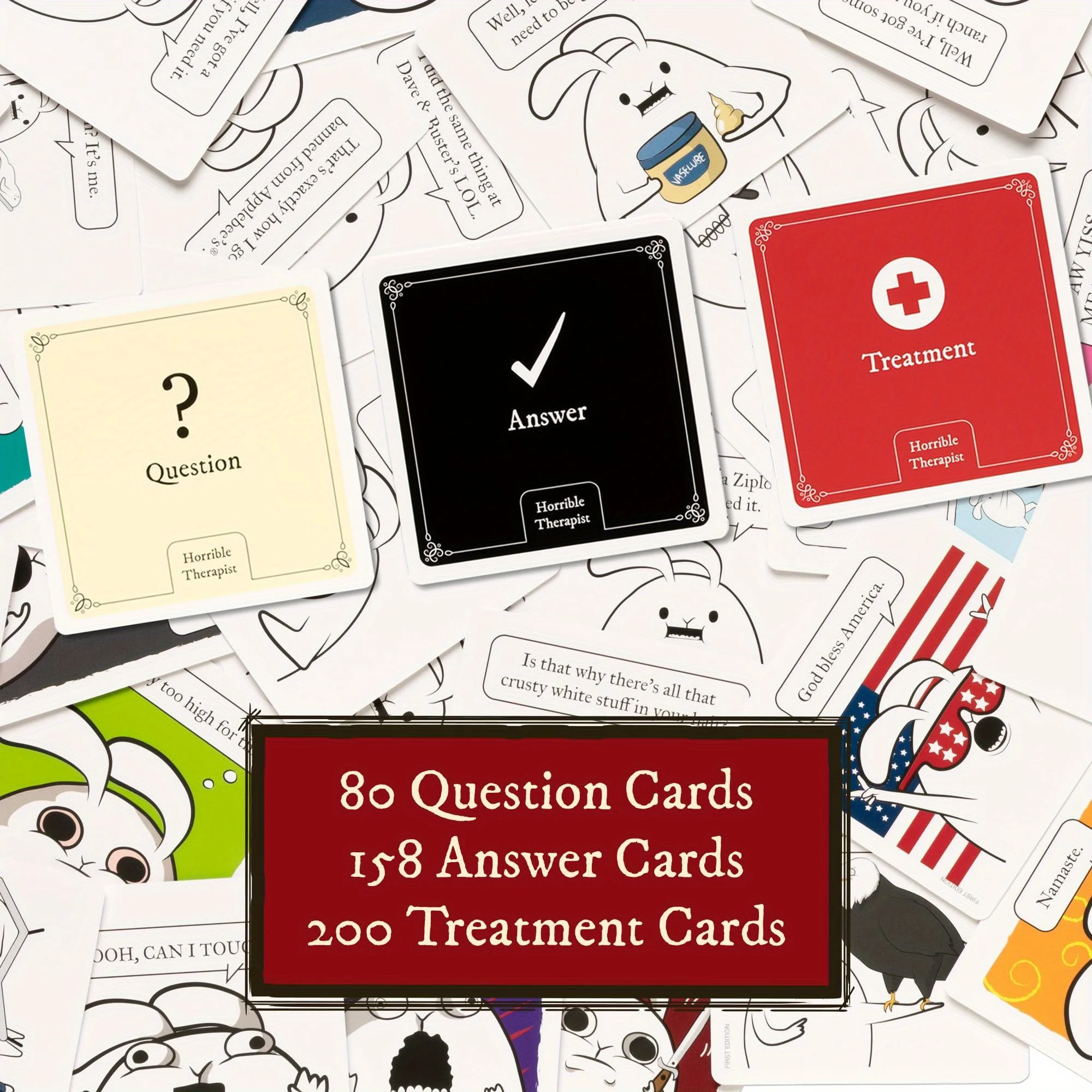 438 cards (80 question cards, 158 answer cards, 200 treatment cards)