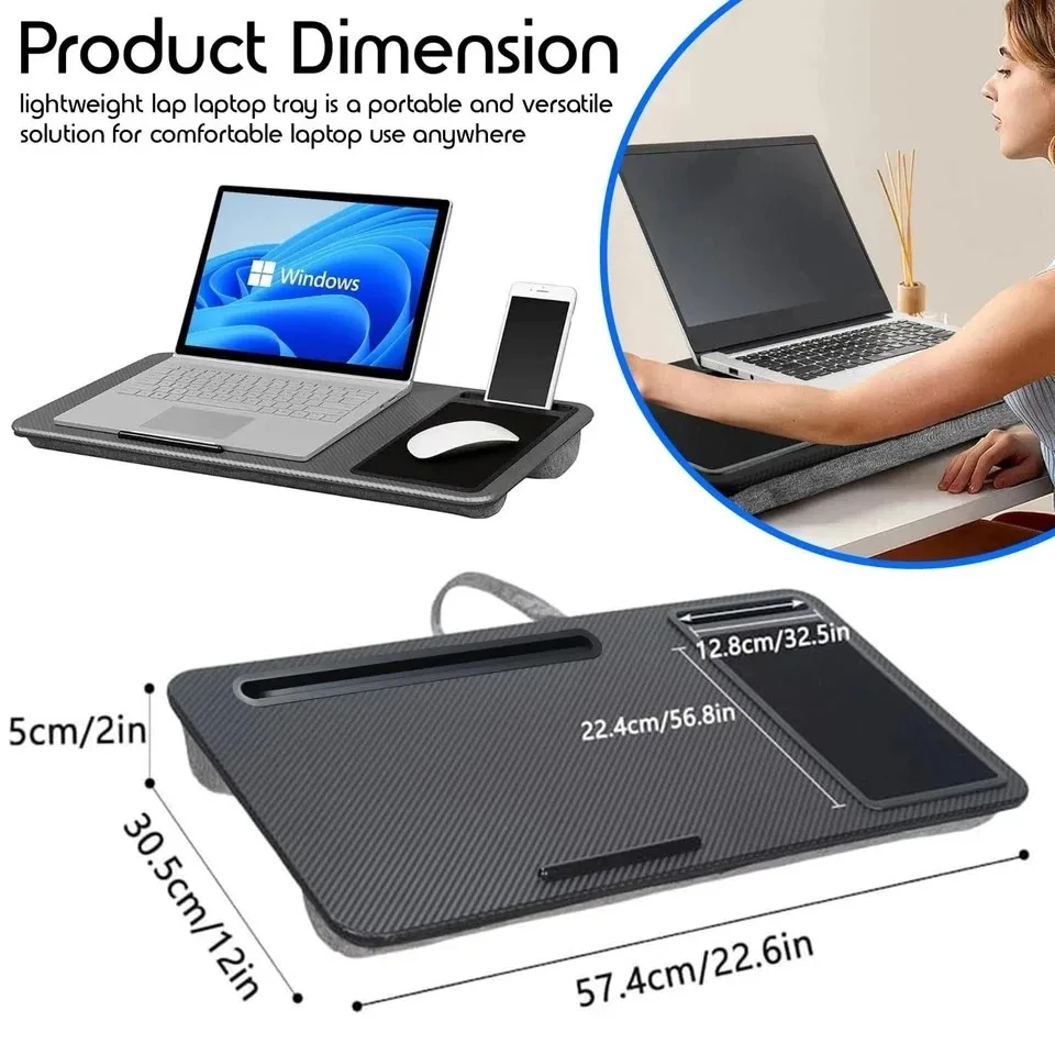 our laptop tray desk for sofa is Finished in a stylish black carbon fiber design, providing a modern look to match your laptop and contemporary furnishings. Equipped with wrist support and a slanted dual-bolster cushion, providing the perfect angle for your lap and that extra comfort that everybody needs