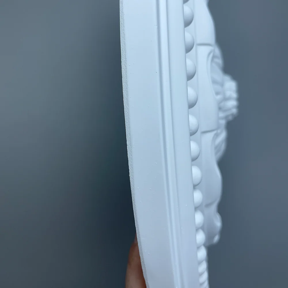This product is made of PU polyurethane material. It is very light, about 690 grams each. The diameter of the disc is 40 cm (15.75 inches). It is white when leaving the factory. It can be decorated directly or painted with various colors. The installation method is Strong adhesive attachment secures with glue or nails for easy installation