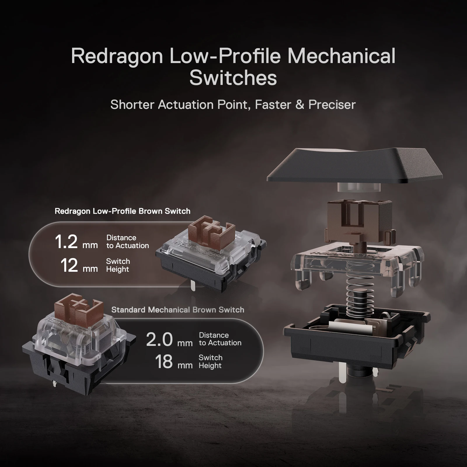 30% Cutted Ultra-Thin: Low profile designed throughout the whole keyboard from the bottom board, middle low-profile red switches (actuation force: 40g) and the top keycaps aim to shorten the distance to actuation as much as possible.