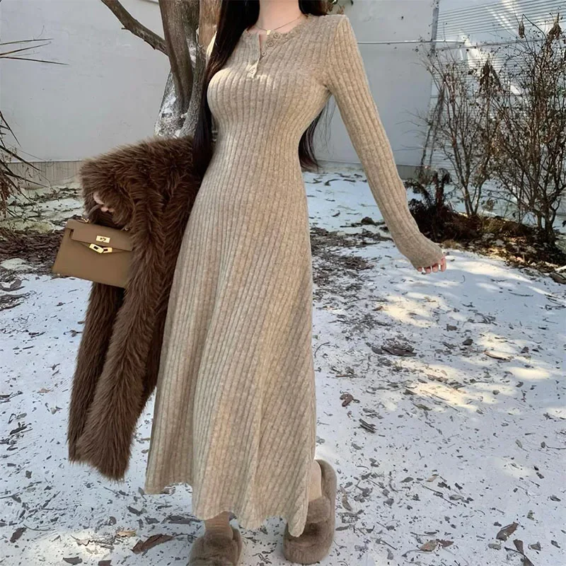 Smvp Elegant Slim High Waist Knit Dresses Women Autumn Winter Long Sleeve Thick Warm Long Dress Vintage Streetwear Vestidos