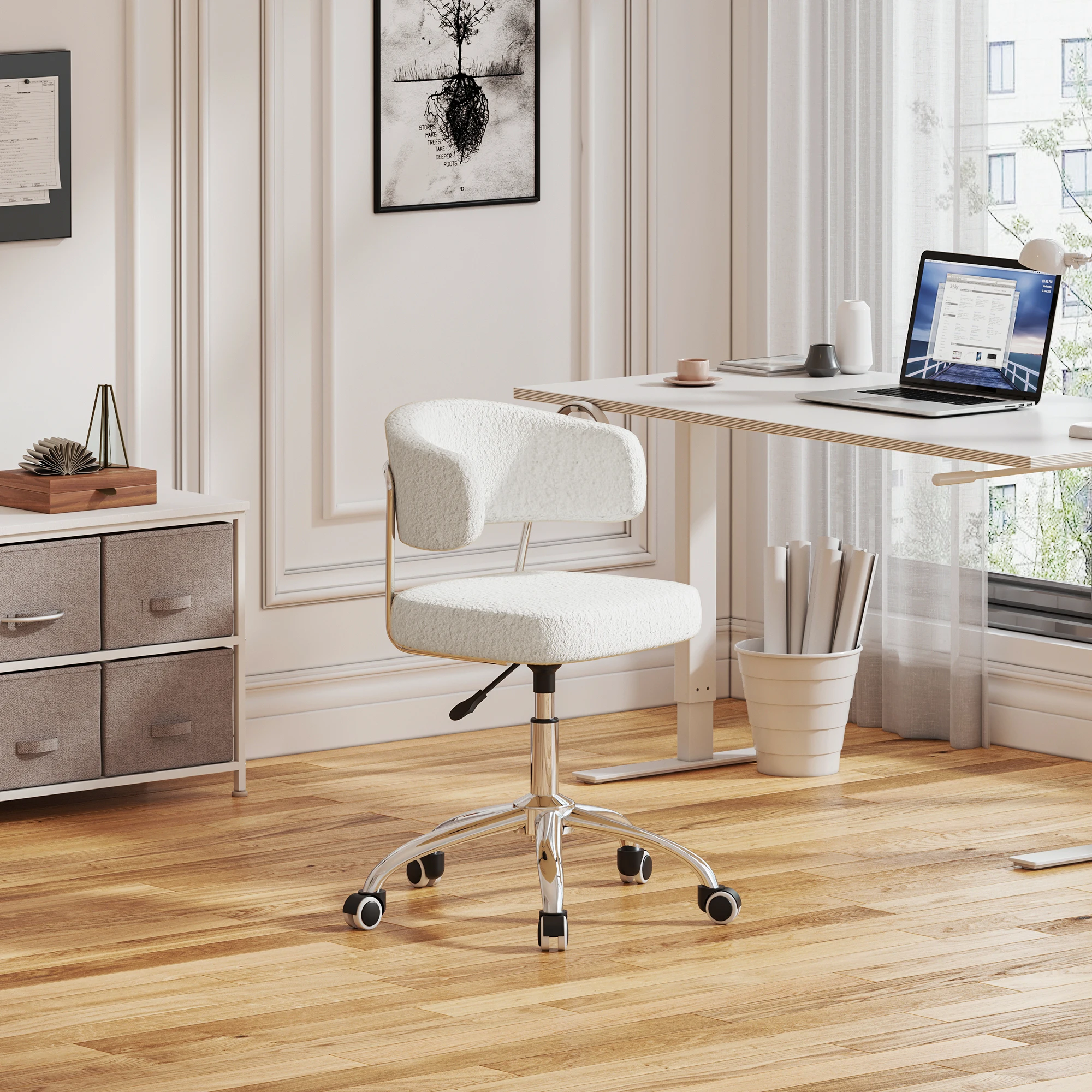 360° free swivel armless design office chair, ergonomic wrap-around lumbar support, sit for a long time without getting tired. High-density sponge cushion with wear-resistant PU leather, both comfortable and durable. Pneumatic lift adjustment, perfect fit for office desk and dressing table. A variety of colours are available, easy to integrate into any space – whether you focus on the office or make-up, it is your ideal sitting companion.
