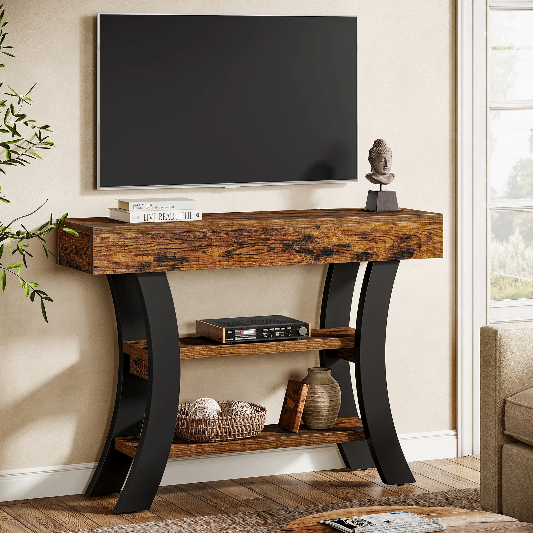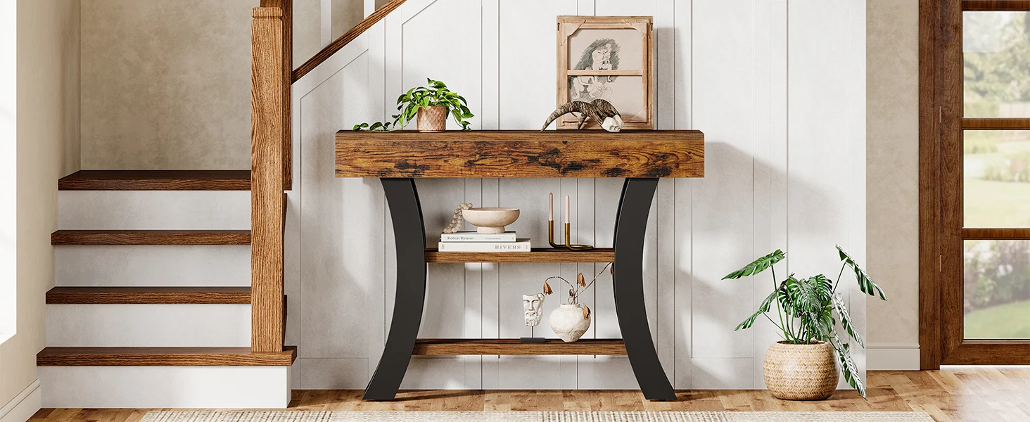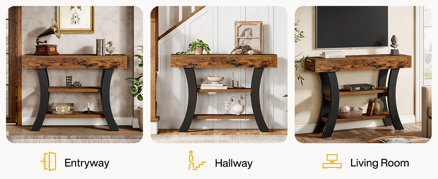 Ample Storage Space: Measuring 41.34″ L x 11.81″ W x 31.5″ H, this small console table features 3 shelves for you to display and store various ornaments, baskets, photos, and other items. Meanwhile, the open design provides easy access to daily essentials