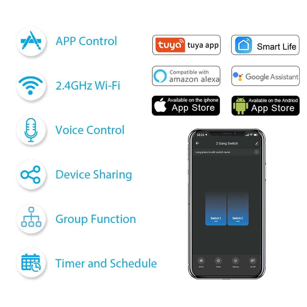 Tuya Smart Life Wifi Switch 2 Gang Relay Breaker Module Google Home Alexa Echo Voice Control Smart Lighting Timer Switch DIY