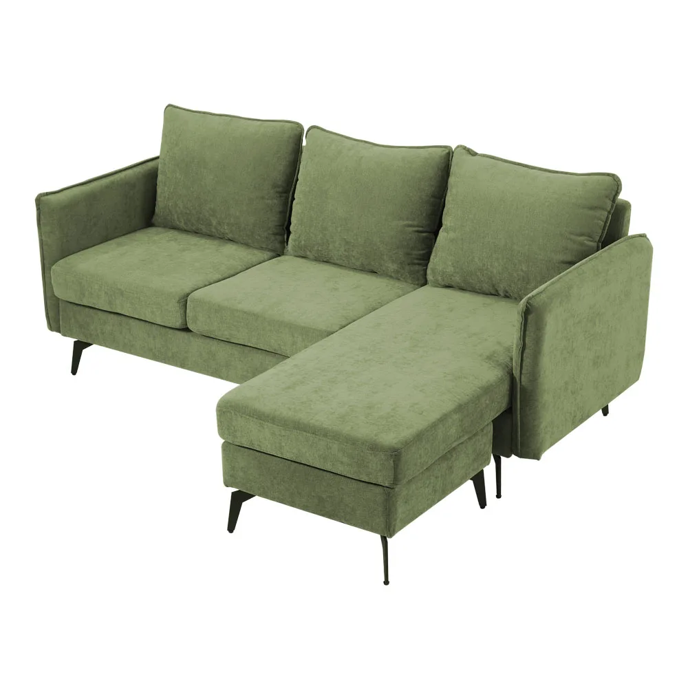 Elevated on black and coated metal legs, this sectional sofa is wrapped in luxurious green polyester fabric, offering a soft yet refined touch. The L-shaped extended seating area not only provides additional space for lounging but can also serve as a versatile ottoman or daybed. Moreover, its interchangeable direction feature allows you to freely adjust its placement according to different room layouts, particularly suited for open-plan living rooms or households requiring flexible arrangements. Its bold design effortlessly combines modern aesthetics with comfort, ensuring it becomes the focal point of any room.