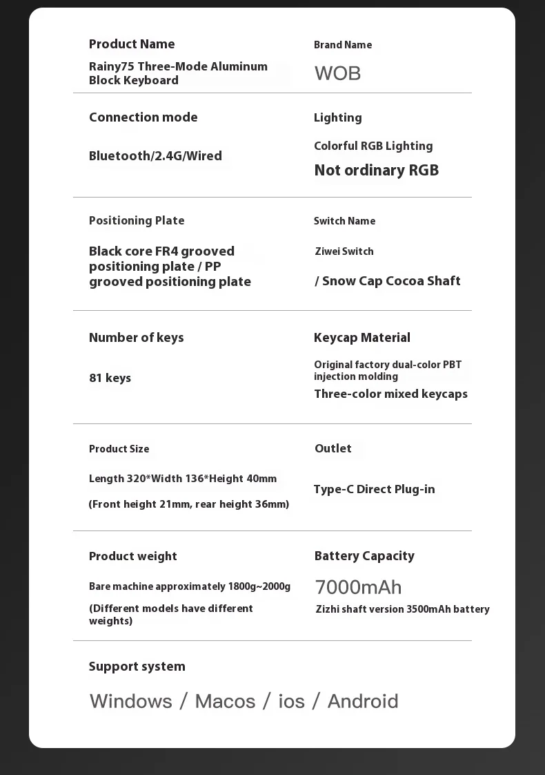 Be the first to review “WOB RAINY75 Wireless Bluetooth Mechanical Keyboard Customizable Aluminum Gaming Esports Keyboard Gift for Rain Birthday”