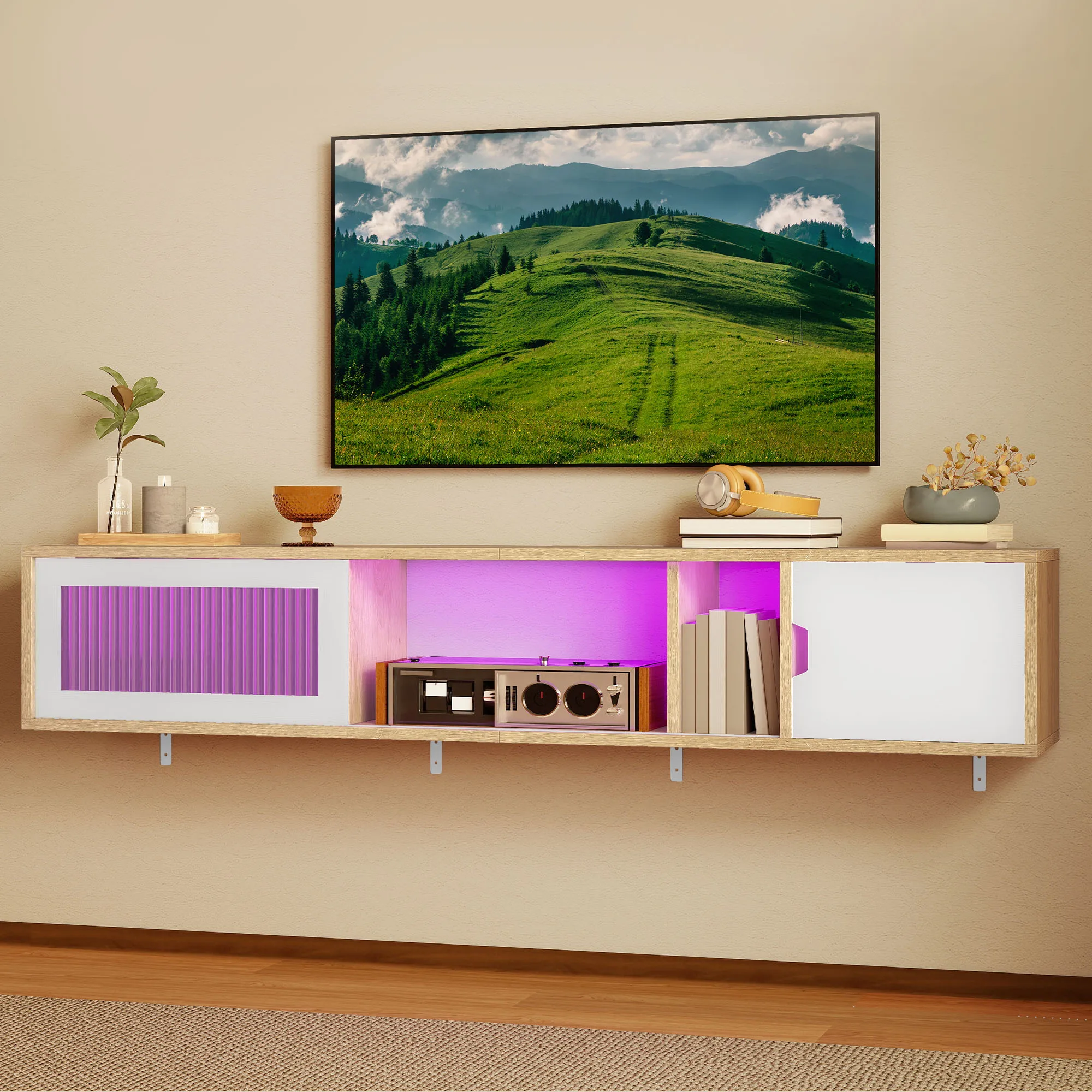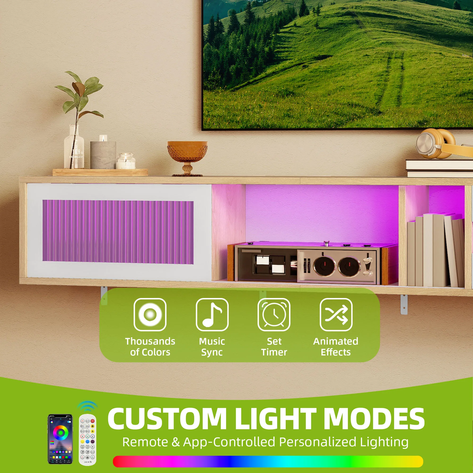 Functions as a complete entertainment center, combining TV support, storage, and atmospheric lighting. Perfect for centralizing media setups in living rooms or adding a compact viewing area in bedrooms, merging functionality with visual appeal.