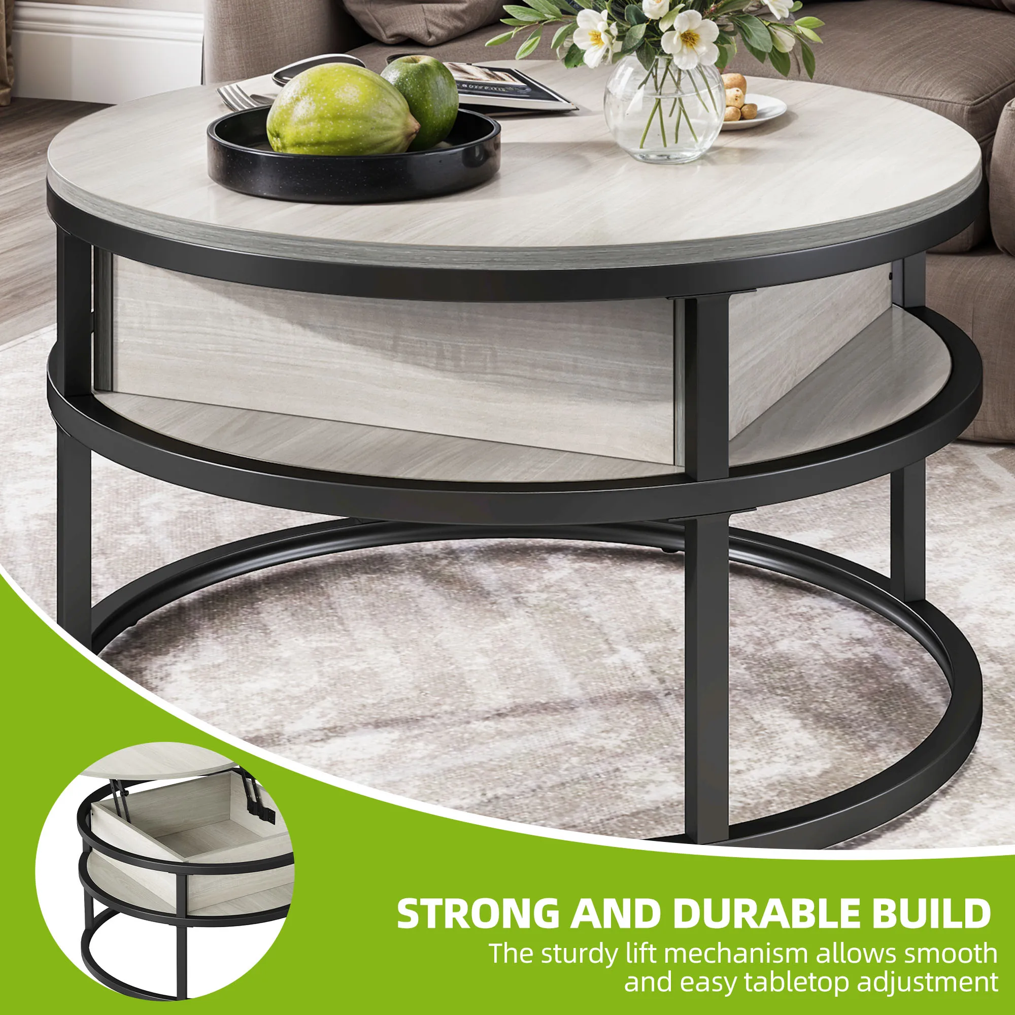 “This versatile round coffee table features a unique lift-top work surface, allowing you to comfortably work, write, or dine right from the comfort of your sofa. The heavy-duty metal lift mechanism ensures the tabletop is raised and lowered gently and quietly, without any jarring vibrations, perfectly meeting your needs.